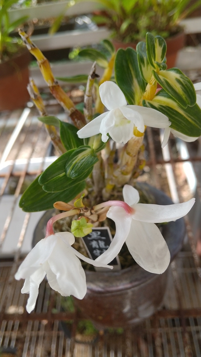 これは小さな花です。兜咲きというのだったかな。もう老化現象が進んできたのか、品種名など細かなことは思い出せません。売ることもないと思うので、長生蘭の一種ということで良いでしょう。